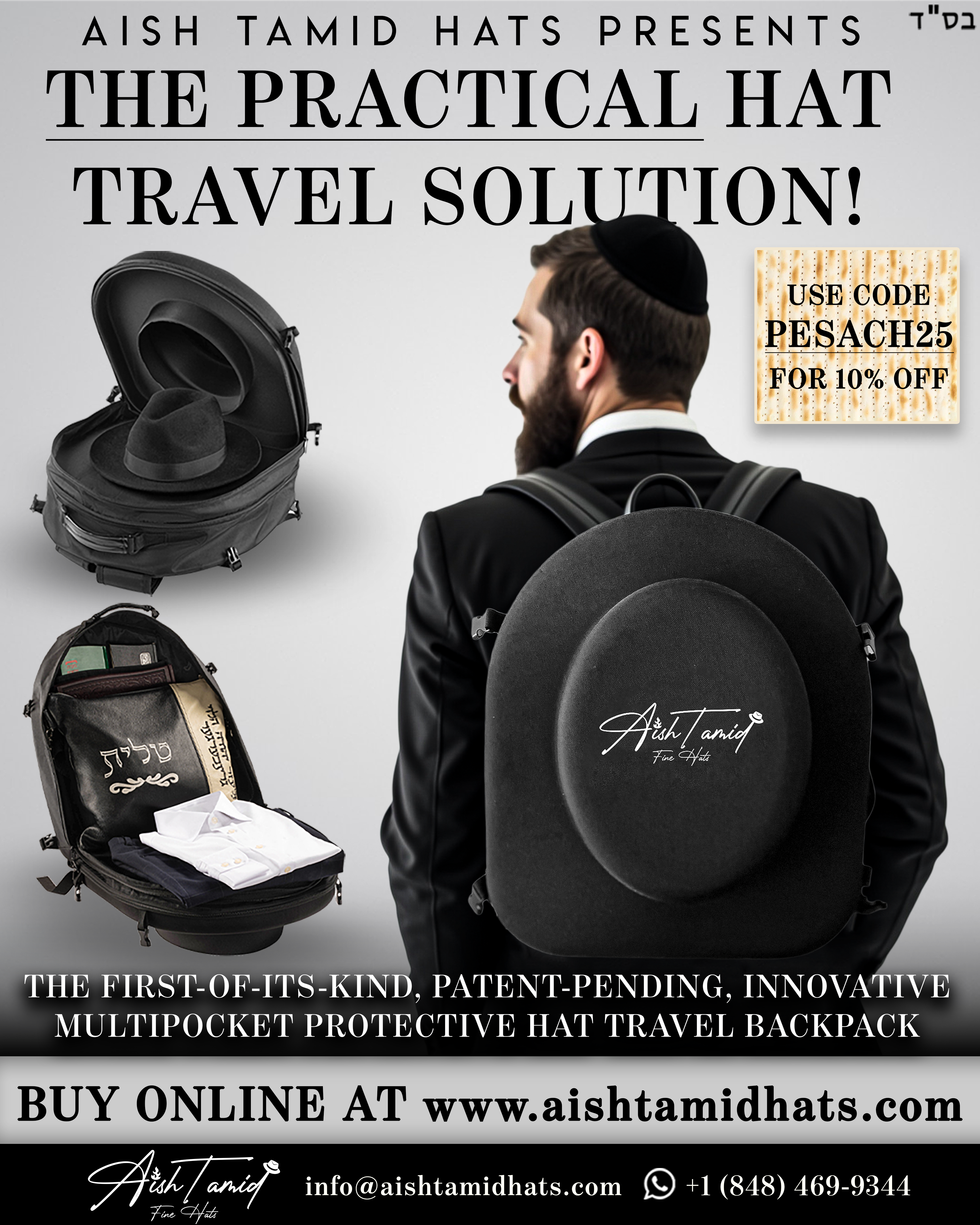 As a small gesture of appreciation, we’re offering preferred pricing on our 2-in-1 hard-shell hat bag—designed to eliminate the need to schlep multiple bags, by combining a secure hat compartment with everyday storage that fits seforim, tefillin, etc. in one clean, dignified bag for yeshiva, travel, and Shabbos.